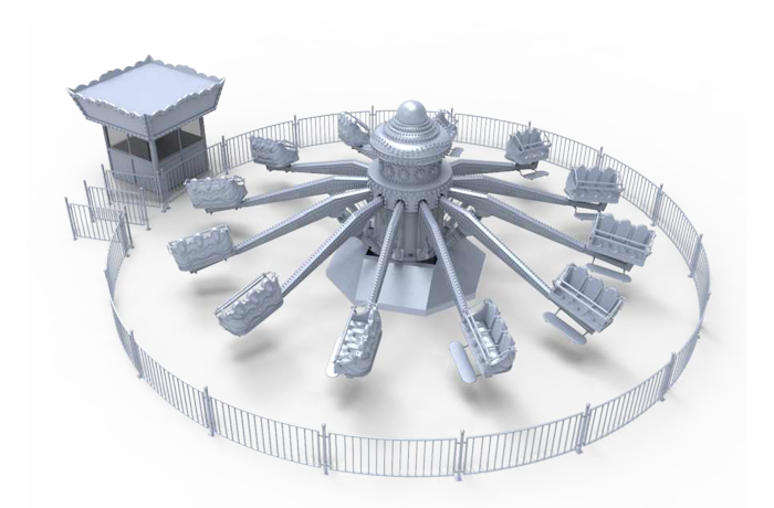 彈跳機中軸為中心帶動周圍十二個座艙繞豎直中軸旋轉,同時座艙伴隨著音樂進行高低、快慢不同的跳躍式運動。使乘客在游玩過程中體驗到旋轉加跳躍的樂趣。