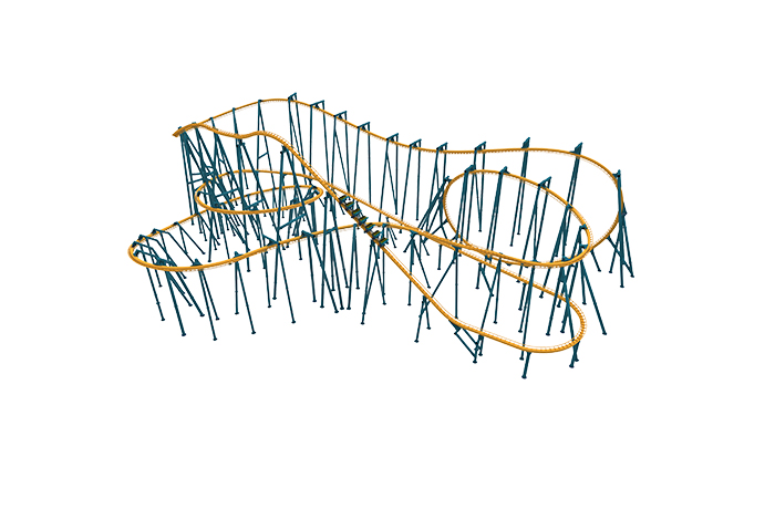 飛行姿態(tài)乘坐式過山車。軌道元素含括急速俯沖飛行、大俯沖飛行、卷餅形倒栽環(huán)、水平環(huán)等,滑行中乘客在軌面仰姿和軌下俯姿兩種姿態(tài)間連續(xù)切換,領(lǐng)略高空翱翔的刺激。與以往的飛行過山車不同,此款飛行過山車車體位于軌道上方,配合水平面上下客平臺(tái),改善了乘客臥姿上下的不適與不便,有效提升舒適度與運(yùn)營(yíng)效率。