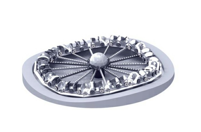 YKC-48B型烈焰戰(zhàn)車,以戰(zhàn)車追逐恒星為主題,中間支撐座裝有回轉(zhuǎn)支承連接16條轉(zhuǎn)臂。每條轉(zhuǎn)臂自帶行走輪,其中四條轉(zhuǎn)臂帶有驅(qū)動裝置,而16個座艙分別安裝在轉(zhuǎn)臂之間。轉(zhuǎn)臂行走輪下方布置有環(huán)形的起伏路軌,在轉(zhuǎn)臂驅(qū)動 裝置的驅(qū)動下,烈焰車體圍繞中心的恒星高低起伏轉(zhuǎn)動,座艙隨轉(zhuǎn)臂旋轉(zhuǎn)運動 的同時,并沿路軌上下運動,使乘客體驗多重復(fù)合旋轉(zhuǎn)運動帶來的樂趣。