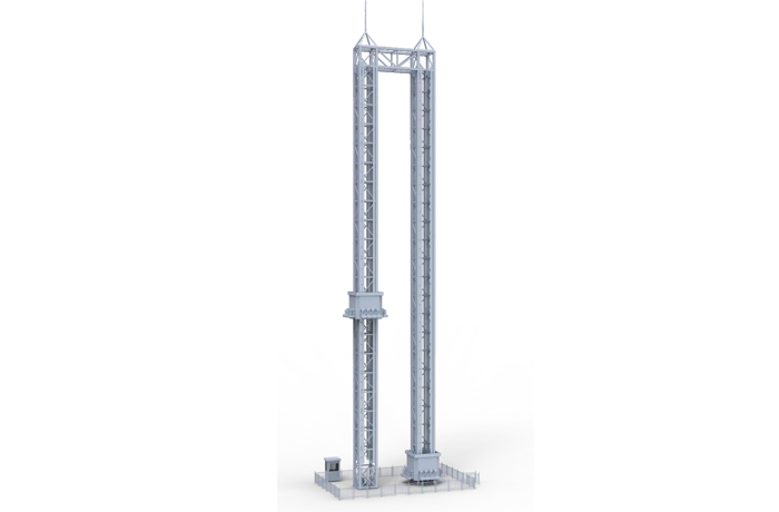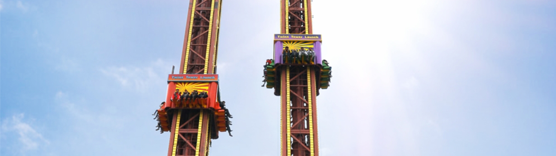雙塔太空梭以雙塔為造型,設(shè)備整體由發(fā)射塔和速降塔組成。座艙在鋼絲繩的牽引下沿著豎直的立柱軌道作上升、下降運(yùn)動(dòng),使乘客在超重與失重的過程中體驗(yàn)加速度升降樂趣。