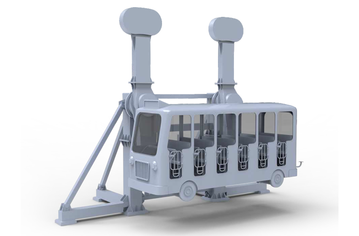 瘋狂巴士配備雙向可逆無級自動調(diào)速系統(tǒng),經(jīng)過減速、分速等一系列機(jī)構(gòu),實現(xiàn)一臺電機(jī)帶動兩個驅(qū)動臂的擺動,帶動巴士的平動,巴士在電氣系統(tǒng)的控制下可以實現(xiàn)正反兩種通過最高點(diǎn)的運(yùn)動,給乘客以歡樂搖擺的體驗。