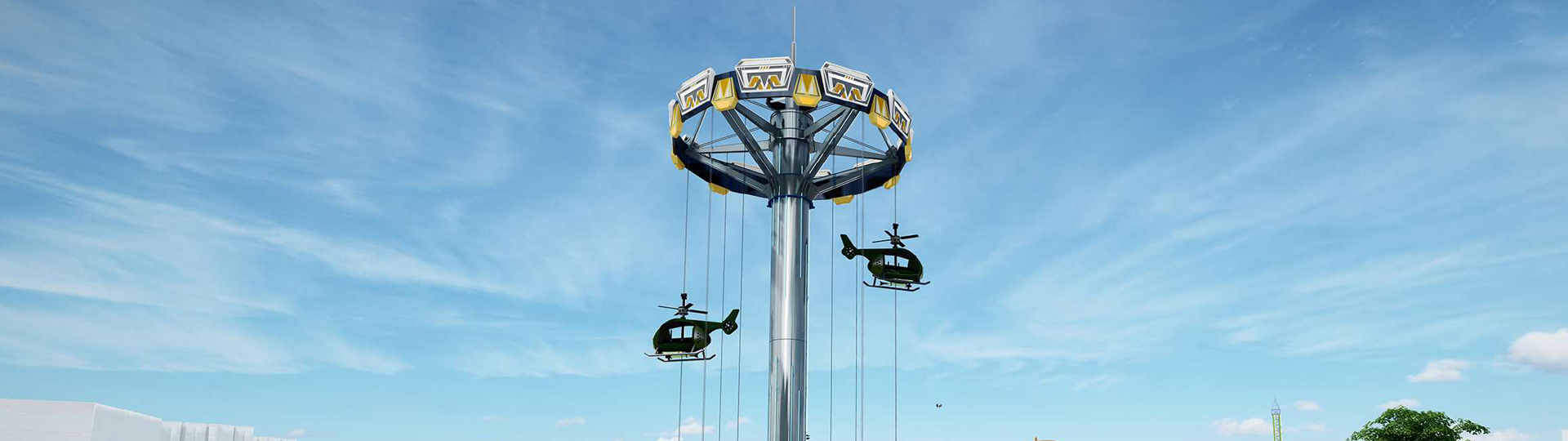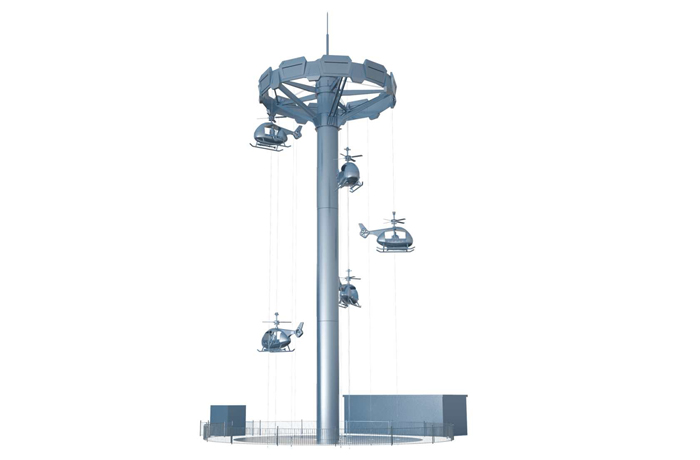 以中國(guó)?助研制直-5直升機(jī)為設(shè)計(jì)靈感,模仿直升機(jī)運(yùn)??式制作的?款游樂(lè)設(shè)備。直升機(jī)的座艙外形,配備軍裝迷彩的配?;打破傳統(tǒng)新穎的背靠背的乘坐?式,觀景視野更開(kāi)闊。運(yùn)?時(shí),乘客猶如在直升機(jī)中,時(shí)?升?頂端,時(shí)?上下起伏,頂上和尾翼的旋翼會(huì)隨上升下降?配合轉(zhuǎn)動(dòng)。