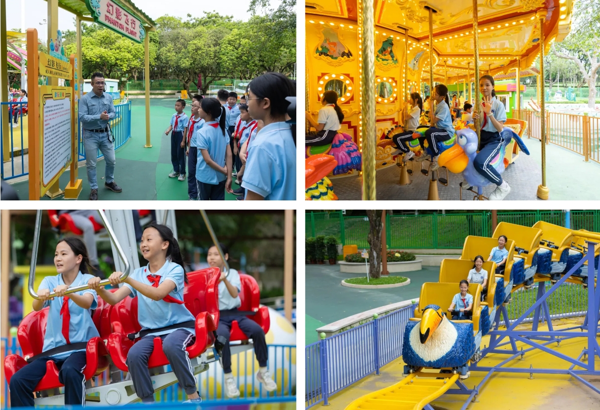 活動期間,中國特種設備檢測研究院游樂設施與客運索道專業(yè)人員、中山市游戲游藝行業(yè)協(xié)會秘書長雷嘉詠帶領中山市港口鎮(zhèn)中心小學學生到訪金馬游樂開展了實地參觀。
